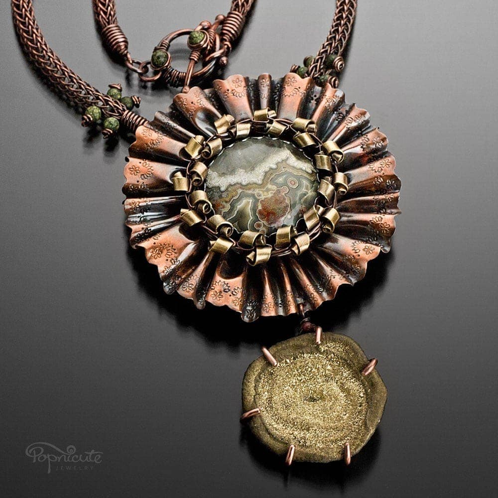 The sparkly drusy stone is rather a soft one, almost shell-like. I think it looks like a gold nugget hence the name Gold Digger. The triad combination of copper, argentium silver, and nu gold brass is completely stunning! I love how the Crazy Lace Agate stone pattern mimics the colors of the metals. The gold color on the drusy is very earthy and poise. Big, bold, and beautiful. It’s a treasure to last a lifetime and more.