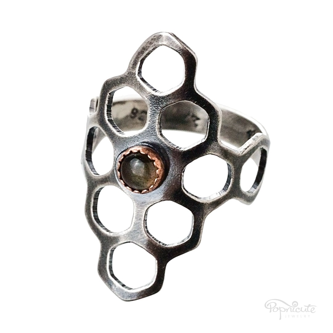An attractive honeycomb beehive ring with the open cells stacked in a diamond/kite shape. In the middle of the ring, rests a flashy labradorite cabochon encased in a copper bezel.