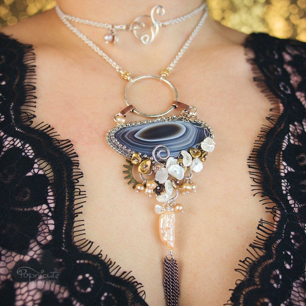 • Mermaid's Treasure necklace with Botswana agate, freshwater pearls, and copper accents. Wire wrapped necklace by Popnicute Jewelry.