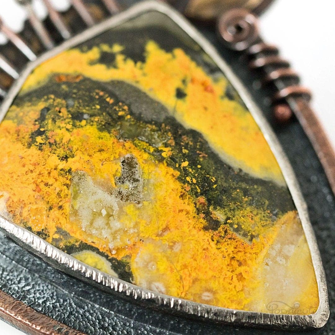 Bright yellow bumblebee jasper is in the center of this joyful mixed metal pendant necklace. Brass flower petals and copper sprouts whimsically topped the argentium silver base. I Am Whole bumblebee necklace is a part of the Earth Nectar collection.