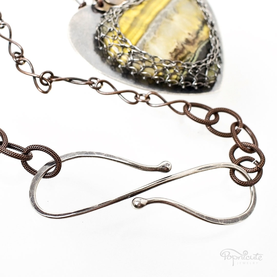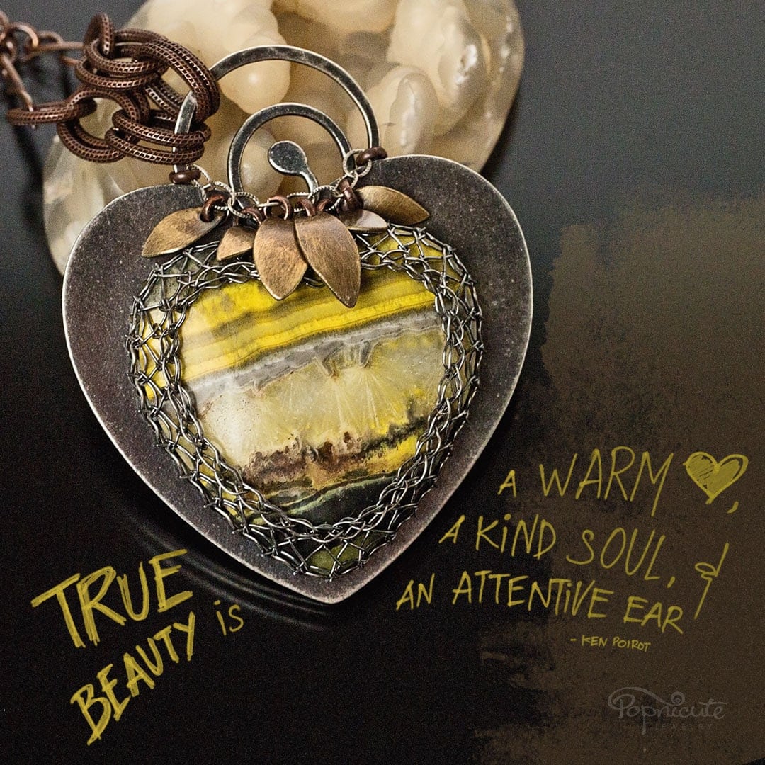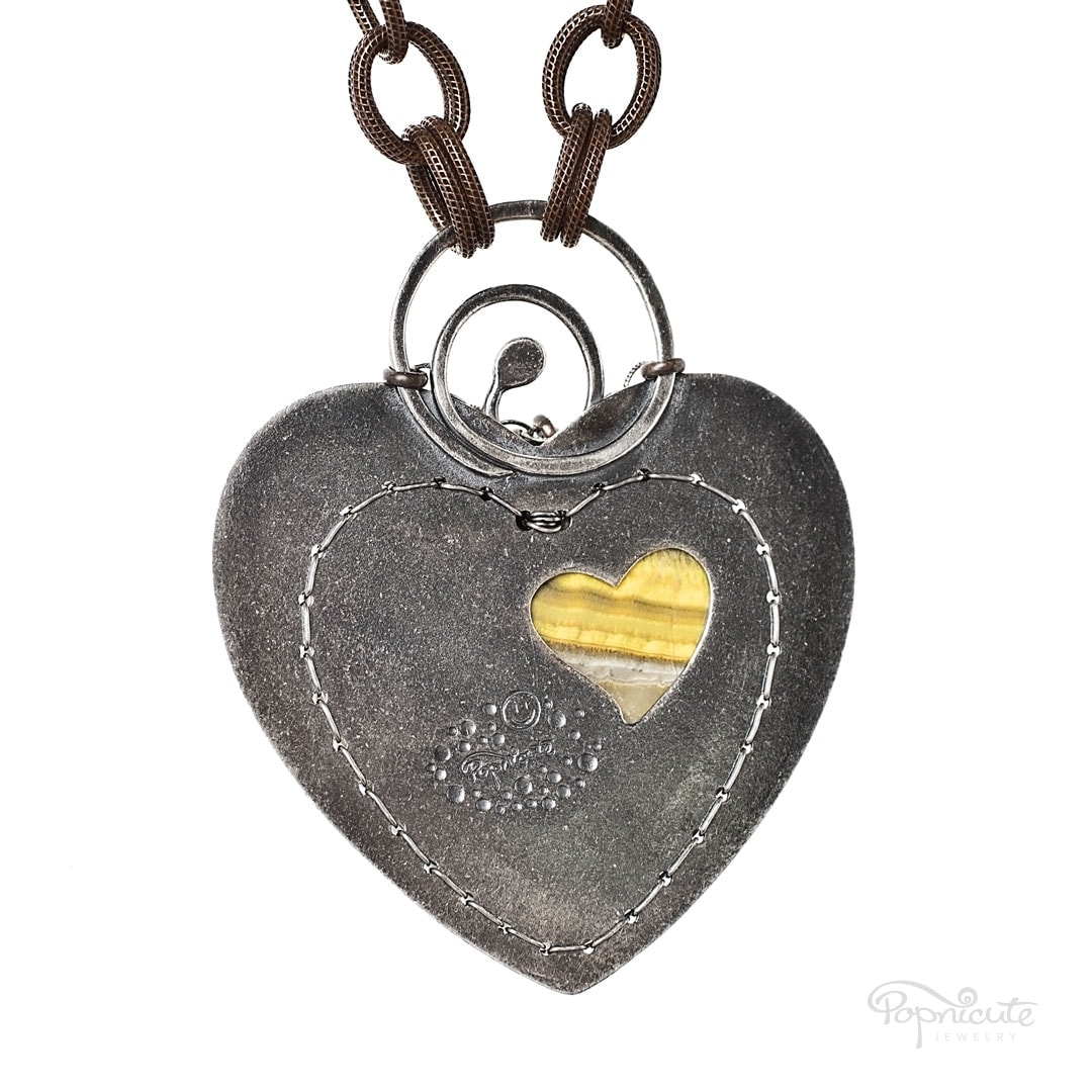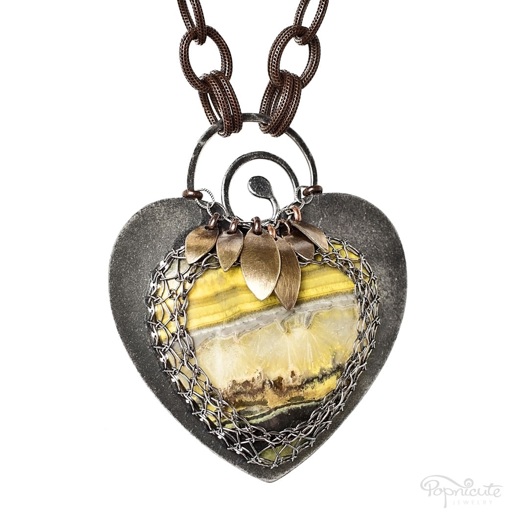 A radiant heart necklace with yellow bumblebee jasper in the center. Encased in Popnicute’s signature Popnicute Hearts design, this necklace is definitely one of its kind. Brass flower petal spray and copper chain whimsically topped the Argentium silver pendant.